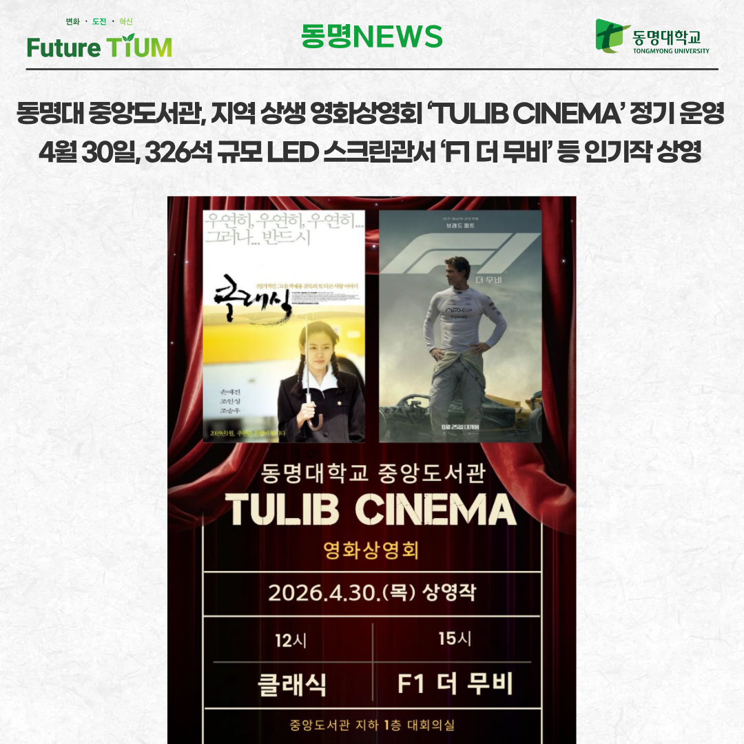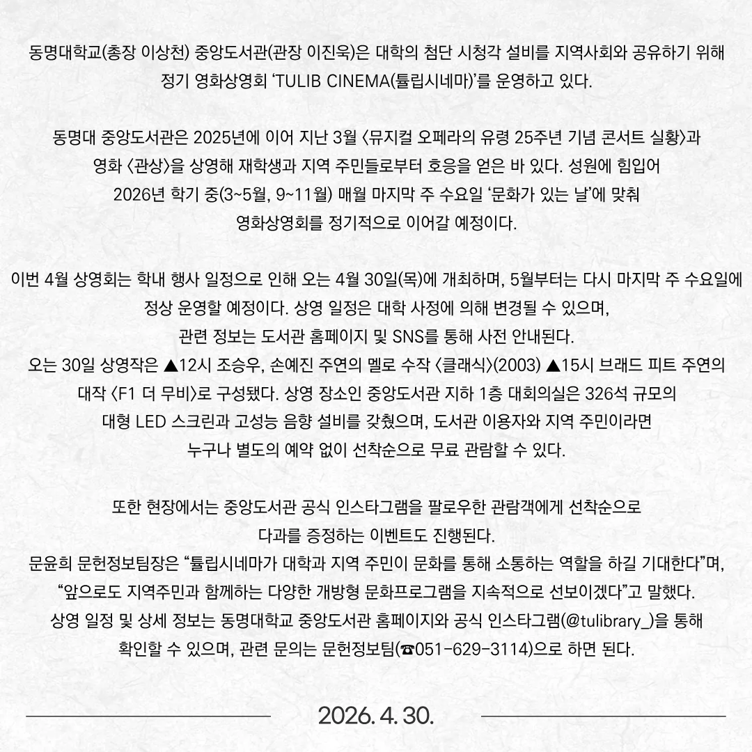 동명대 중앙도서관, 지역 상생 영화상영회 ‘TULIB CINEMA’
